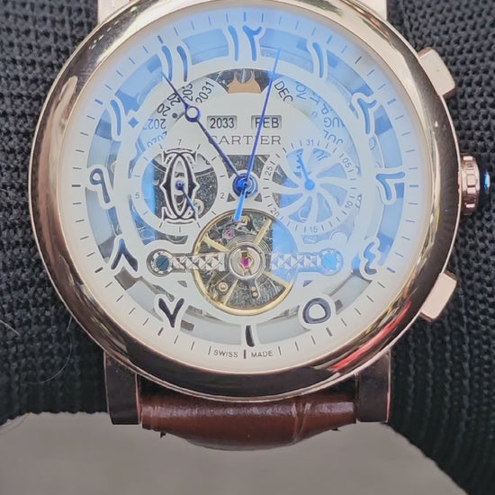 Cartier Luxury Skeleton Dial Mechanical Watch – Gold Case & Brown Leather Strap